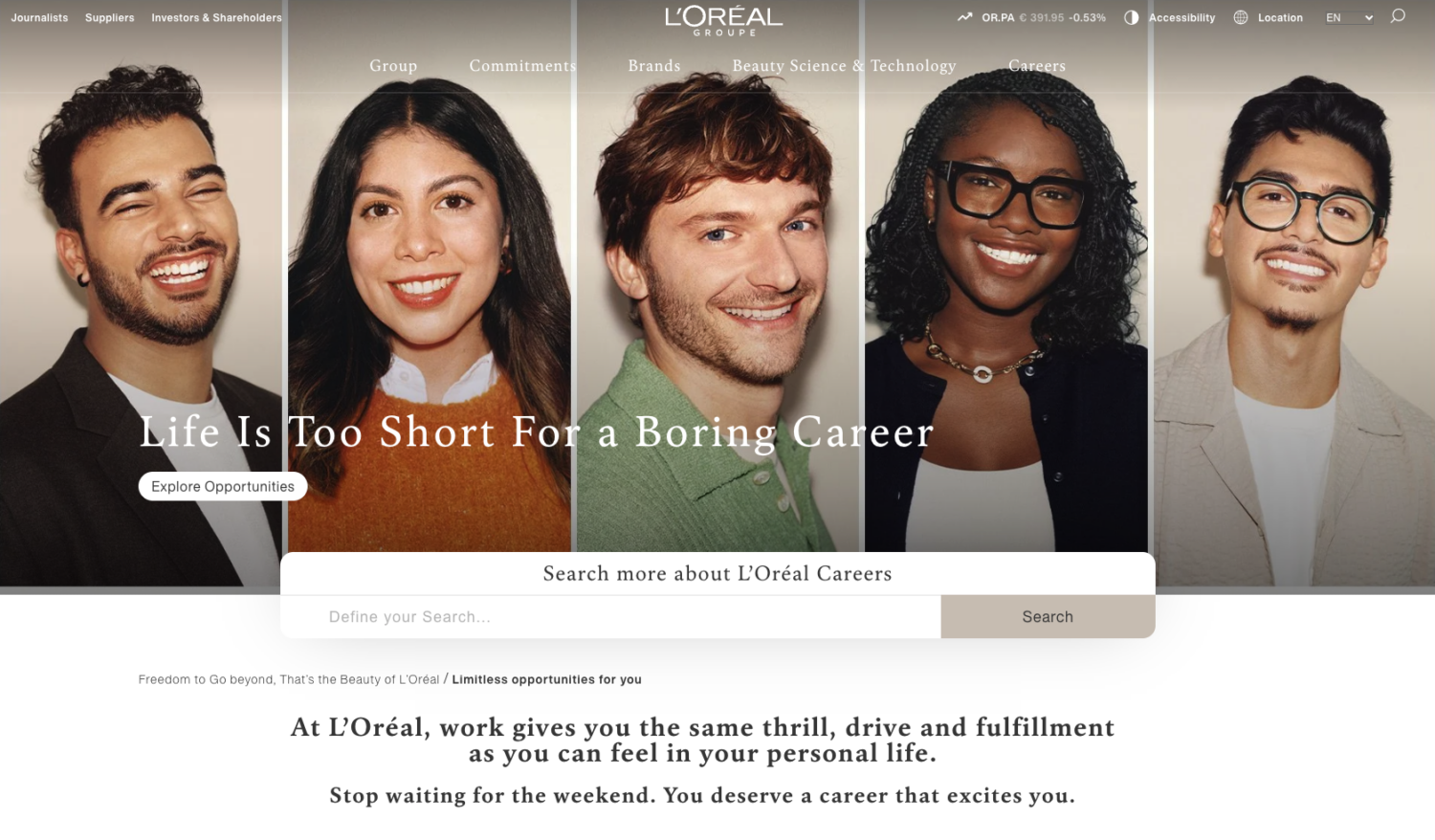 Mais pour rappeler qu’il existe aussi des environnements où l’on peut se projeter. Le meilleur exemple qu’on puisse citer dans les toutes dernières campagnes marque employeur 2026 est celui de l’Oréal avec cette signature incroyable « Life is too short for a boring carrer ».
